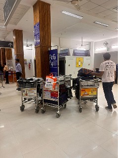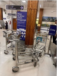 Trolleys full of bags waiting for baggage screening, with long queues during peak hours.