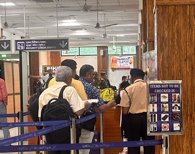 A bottleneck created because of multiple re-screening and people opening and closing luggages.