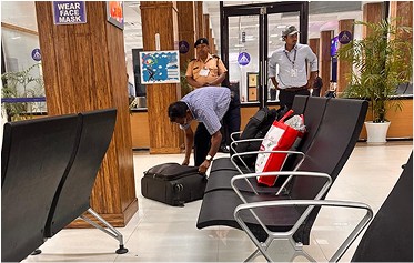 More people lined up for baggage screening, while one person, feeling embarrassed, sat on the ground sorting through their belongings.
